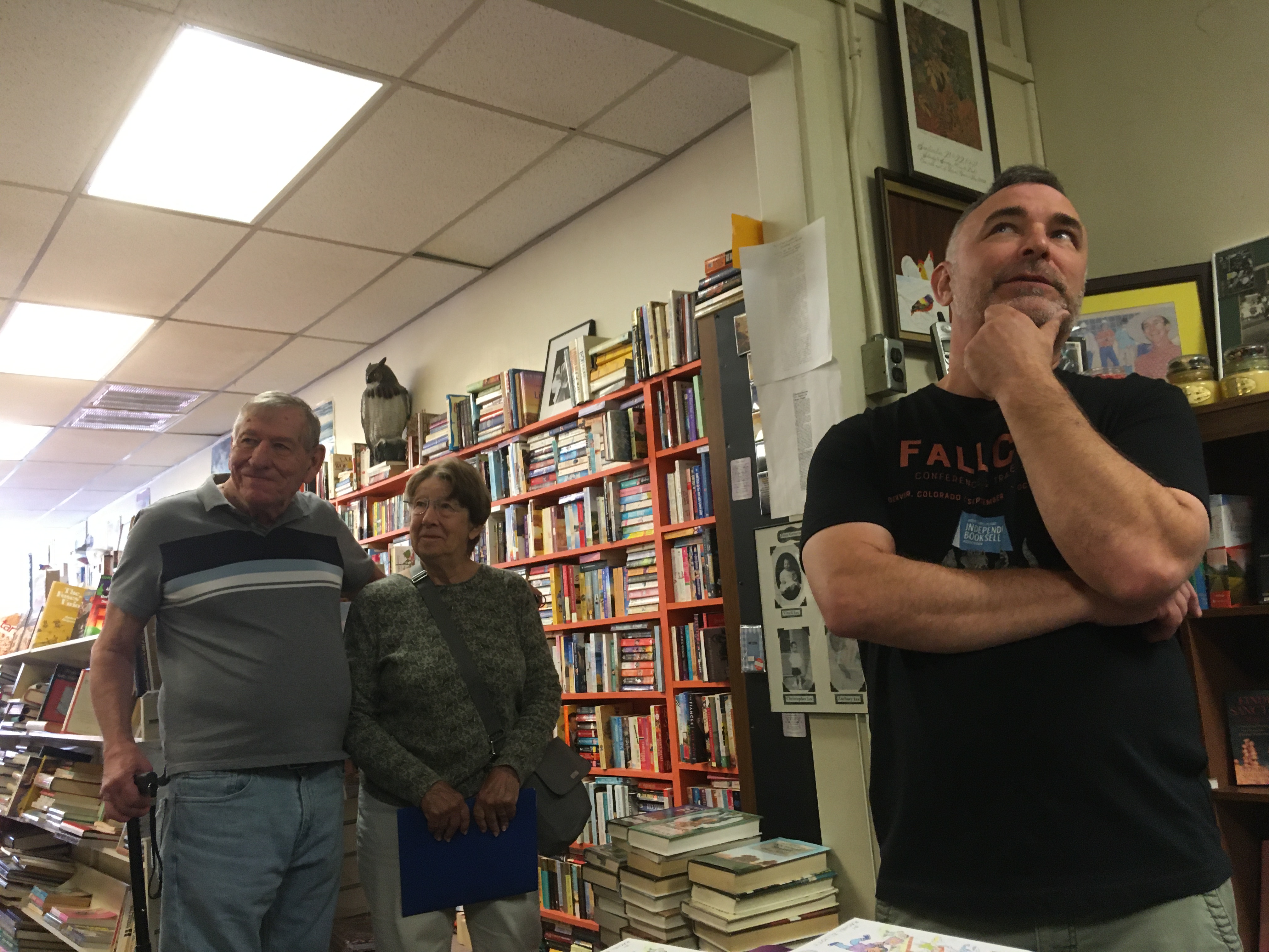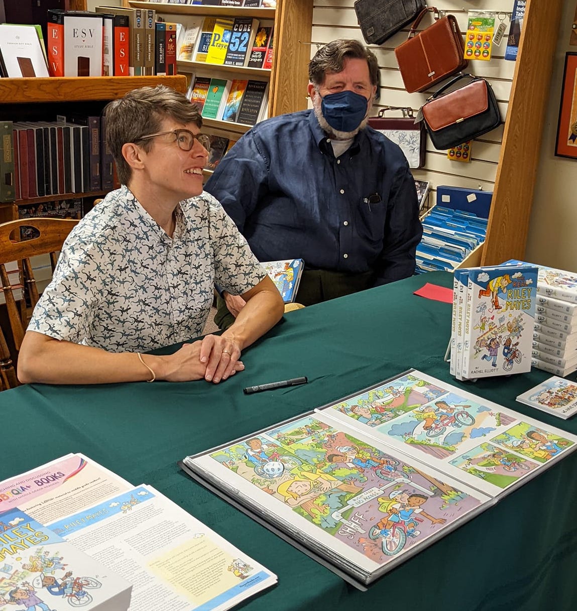 My third stop, and the one closest to my heart, was my hometown. The Pryor Book Exchange is run by Chris Hardy (pictured in the gallery above rubbing his chin and possibly thinking about a joke.) Chris is a great guy. He knows all his Mayes County customers, and orders books with specific customers in mind. During the height of the pandemic, he delivered books by bicycle. He stocks an impressive amount of books by Native and Indigenous authors, for kids and adults. The weekend of my visit coincided with homecoming and class reunions, so the store was busy with former teachers and students. They took home free “Say Gay” postcards and LGBTQ+ book discussion guides. It was a joy to share this book with the people who taught me to draw and write stories. That night, my folks had a party in the yard with barbecue and banana pudding.