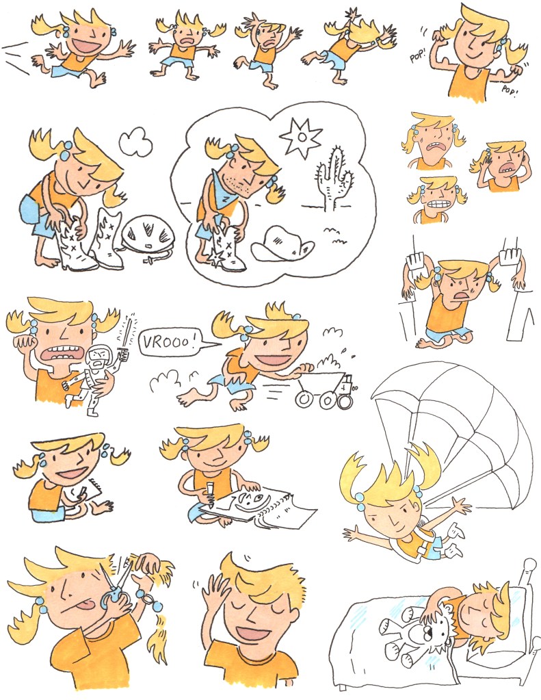 Around 2015, a first grade girl started appearing in my sketchbook. She played with dump trucks and ninja toys; she imagined herself as a cowboy with 5-o’clock shadow, and she did her own hair in a dude-ish cut. As I drew her more and more, she started to talk in speech balloons and think in thought clouds.