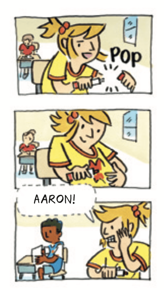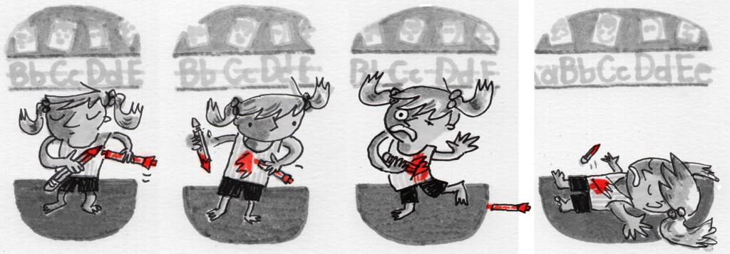 Soon, I was drawing multi-paneled scenes from her life, such as the series below: a red-marker death scene at the front of the classroom. I slid these into my portfolio, hoping I’d score a picture book illustration gig. Art directors were confused. “Picture book readers wouldn’t get this,” they’d say, “toddlers don’t really know what death is.”