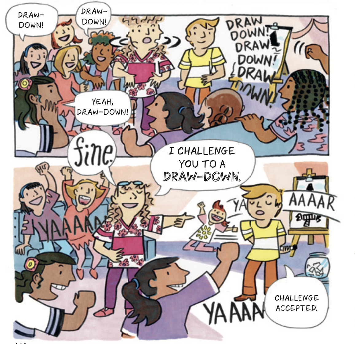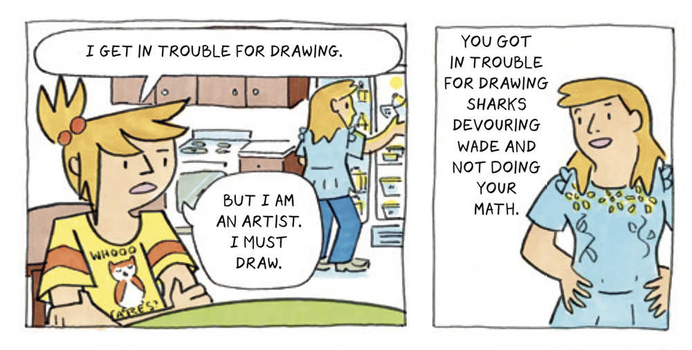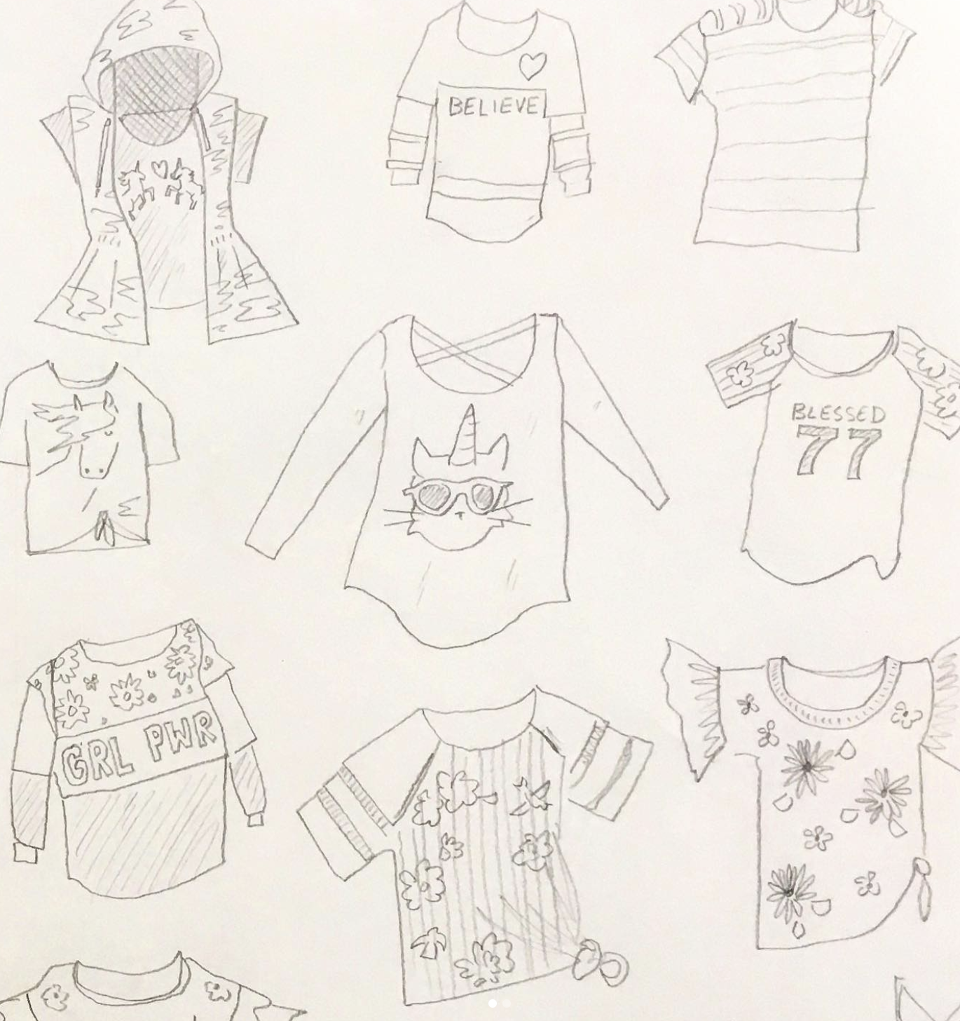 Can I tell y’all a secret? I like drawing a lot more than reading articles on the internet. My favorite research involves drawing from photos or the people I see around me. When the time came to draw the Girls’ Night chapter, I was a little overwhelmed. How do I draw a house full of girls? Girls that don’t look the same, and each have their own personality? I filled pages of a sketchbook with drawings of kids’ clothes available at small-town stores. You might not see an exact version of each shirt in the scene, but this research helped me dress each girl in their own unique costume.