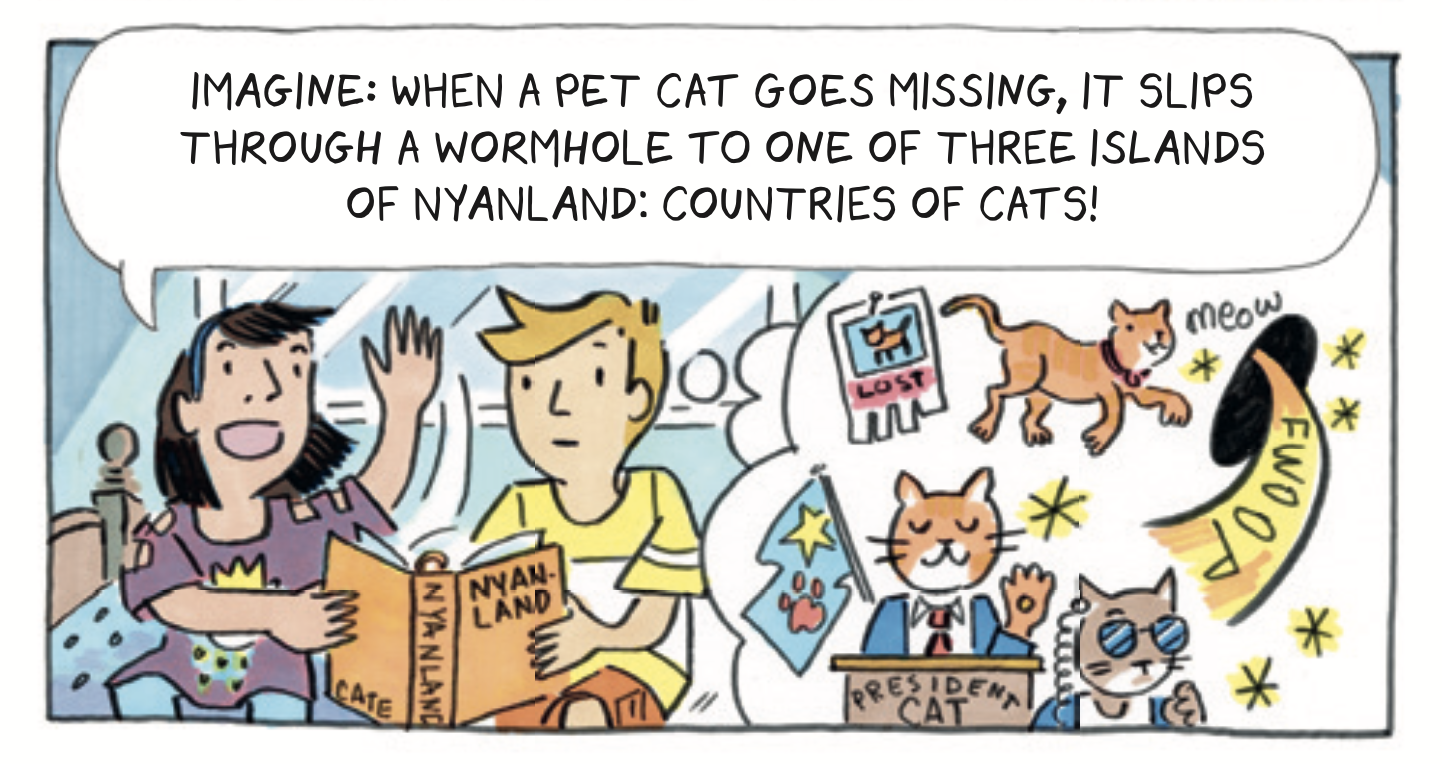 Riley and Cate are very imaginative kid-characters. But in early drafts, their imaginative play seemed unrealistic. They played more like six or seven year olds than like ten or eleven year olds. I found a science journal article called “Imaginary Worlds in Middle Childhood: A Qualitative Study of Two Pairs of Coordinated Paracosms.” Those are fancy words for “We Interviewed Some Kid Friends About The Imaginary Countries They Invented Together And Here’s What They Said.” The authors discovered that 10-12 year olds love creating imaginary countries with their own flags, languages, foods, laws, and even wars. This research helped create Cate’s fictional cat universe: Nyanland.