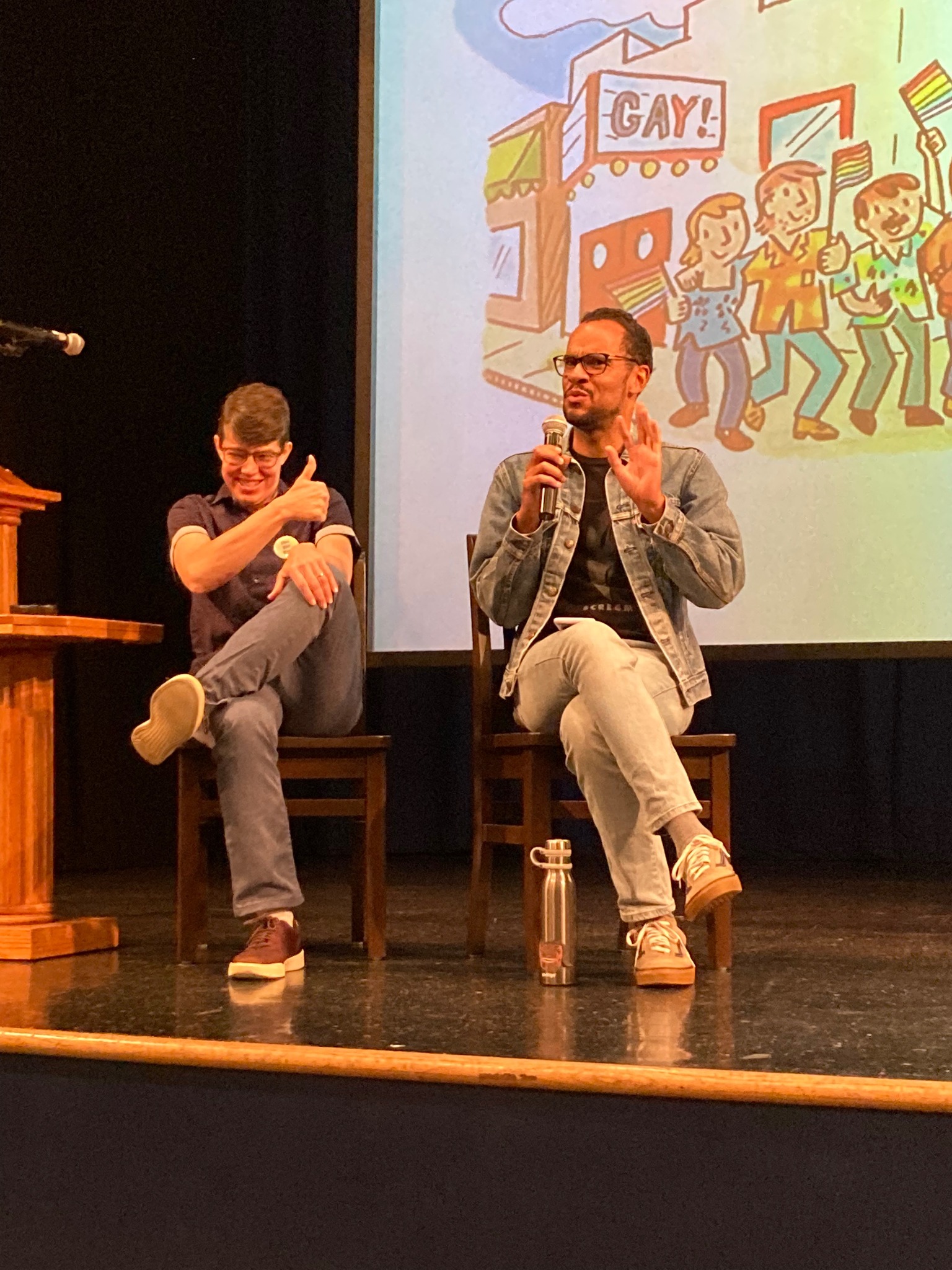 My debut graphic novel THE REAL RILEY MAYES is set in Oklahoma. See that tell-tale sky blue flag on the cover? I grew up there, and it was a joy to draw little slices of life from my home state into this book. There are Chevy Silverados in the drop-off circle, mullet haircuts with no irony whatsoever, and frito chili pie in the school cafeteria. There’s also LGBTQ+ characters in the book. Sometimes Oklahoma’s lawmakers are hostile to LGBTQ+ issues and rights, but Oklahomans in general are supportive, and there’s a lot of queer community to be found… in the book, and in real life. Last week I got to visit my home state for four stops on a quick book tour. Here’s the amazing people and places I got to visit: