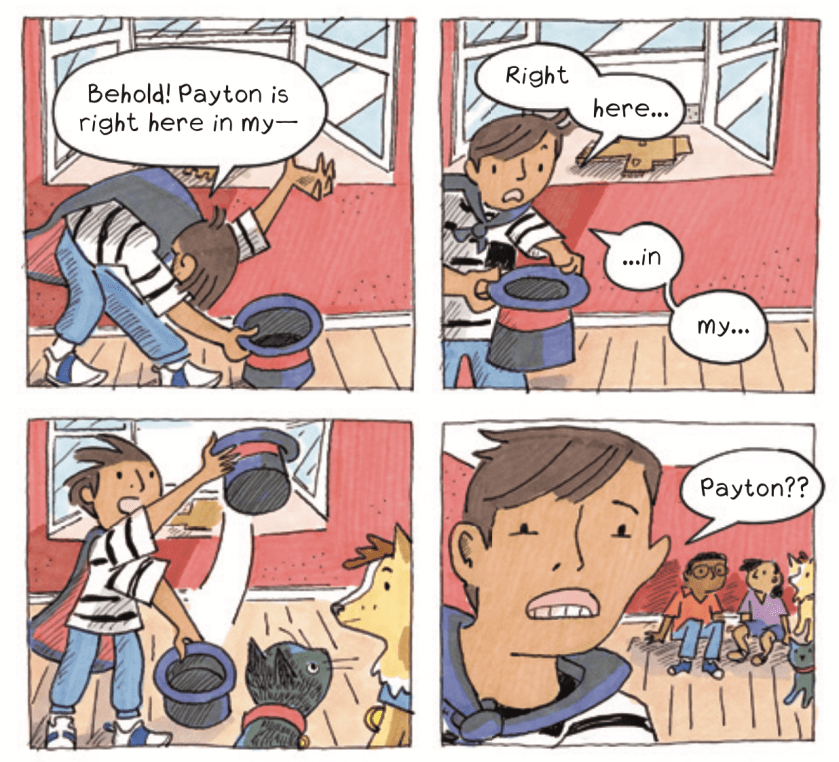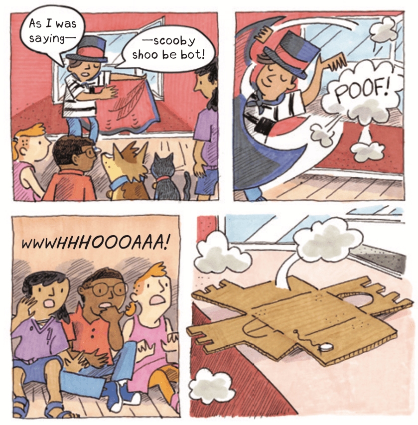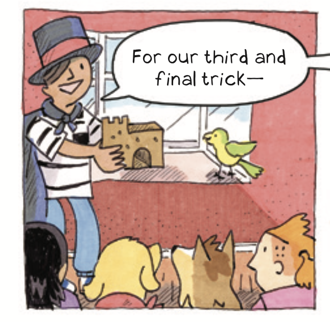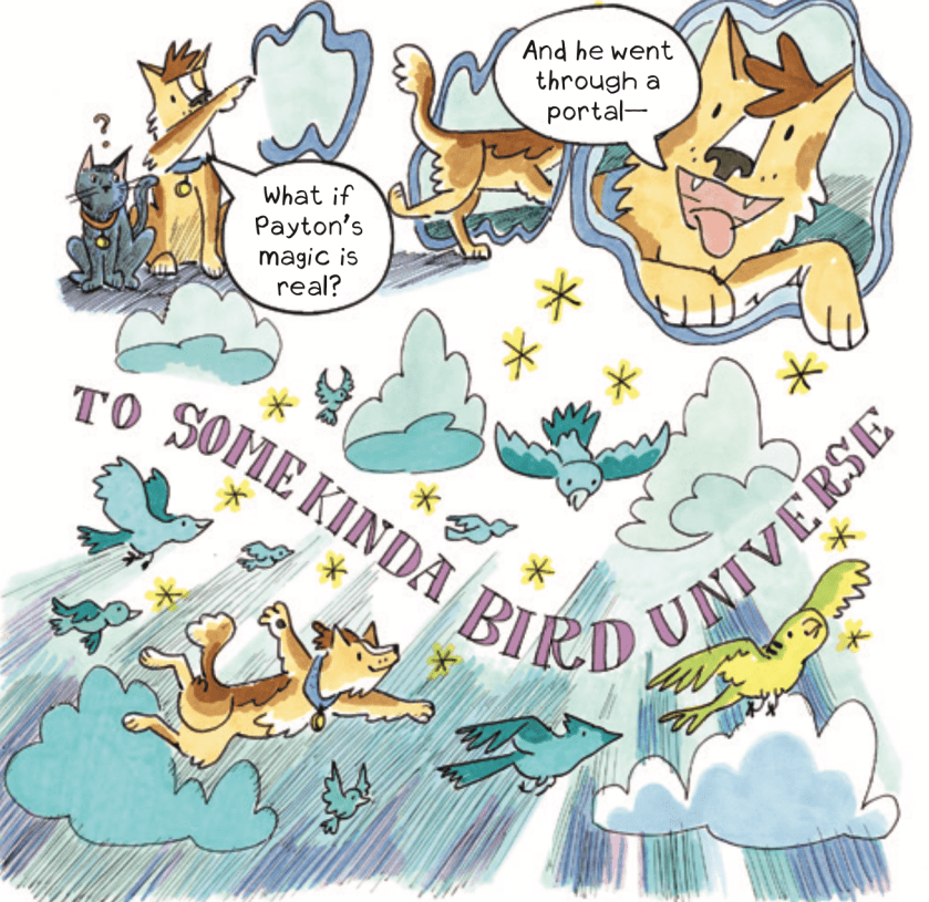 Solve mysteries in and around Foggy Court with black cat detective Bel and her goofy dog brother Zeb! In book #1, A Case of Bird Problems, local prankster parakeet Payton goes missing during a neighborhood magic show. Is this a prank? A petnapping? Or actual magic? While their human owner Josephine and her moms help search Perpleck City for the bird, Zeb and Bel run their own adventurous and hilarious investigation. There’s a suspect board on the refrigerator, a musical number on the balcony, and cameo appearances from corgi butts. Keep your eyes peeled as you read, and you might crack the case ahead of Zeb and Bel!