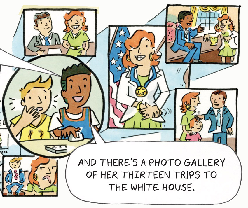 In the book THE REAL RILEY MAYES, Riley is searching for new friends… but she’s also searching for information about her favorite TV comedian, Joy Powers. Aaron helps her surf the web, but they don’t find an email or mailing address for fan mail. Instead, they find an intimidating photo gallery of her thirteen trips to the White House. Riley’s research into Joy Powers’s life is sometimes thrilling, sometimes daunting.